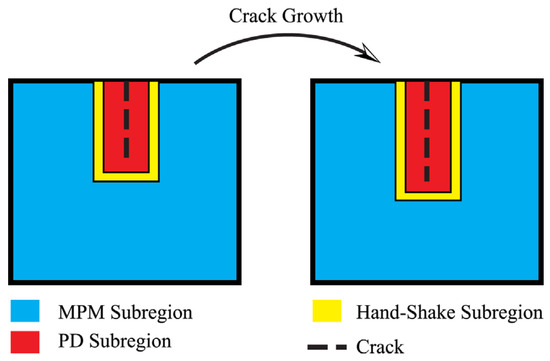 Due to the great flexibility of the peridynamics (PD) in simulating dynamic fractures [62,63], and the fact that both PD and the MPM are particle methods that simulate the dynamic processes of particles through explicit time integration, the combination of PD and the MPM is very natural. Lyu et al. [64] simulated plastic fracture. Zeng et al. [65] made improvements by modifying the cutoff radius to , thereby eliminating the restrictions of the original PD due to volume integration, and proposed a volume-corrected PD combined with the MPM/GIMP scheme to simulate the evolution of fracturing under transient loading. The PD combined with the MPM scheme requires the pre-segmentation of the simulation subdomains. To overcome this disadvantage, Zeng et al. [56] proposed an adaptive peridynamics MPM, where the simulation region is initially discretized by MPM particles, and during crack growth, the MPM subregions will adaptively switch to PD subregions (see Figure 11), successfully simulating the spallation of a one-dimensional rod, mode I fracture propagation in a pre-cracked plate, mixed-mode crack initiation problems, and the Kalthoff–Winkler experiment.