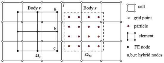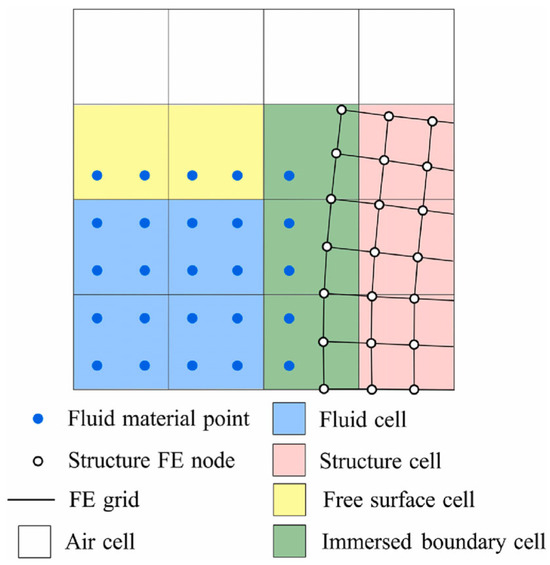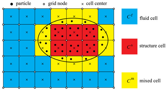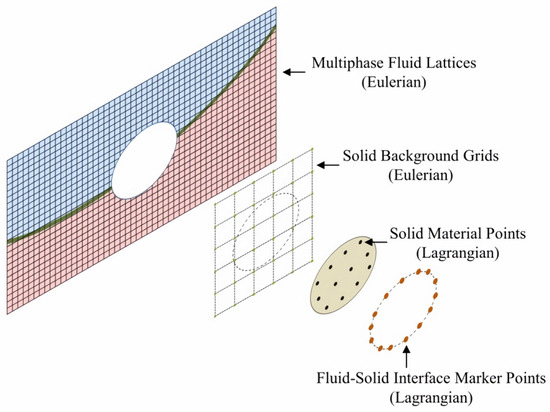 In the process of dynamic fracture, the thin geometric shapes of small debris and new FSI interfaces are produced, making the reconstruction of FSI interfaces challenging. The immersed boundary method (IBM) has shown significant advantages in simulating FSI with complex boundary geometries [66,67,68]. Ni et al. [69] developed the immersed boundary MPM to simulate both fluid–structure coupling and dynamic fracture problems. In this approach, the MPM solver is used to simulate the extreme deformation problems of solid structures, and the Lagrangian-based continuous IBM simulates FSI, thereby strictly ensuring the boundary velocity conditions at each time step without the need to reconstruct the FSI interface, which improves solution efficiency to some extent. The multi-material ALE (MMALE) method does not require tracking complex material interfaces and can efficiently simulate the compressible flows of multiple materials [70]. Therefore, Kan and Zhang [71] proposed the immersed ALE multi-material MPM for FSI problems involving multi-material fluid flow and extreme structural deformation accompanied by crack and fracture propagation. In this method, the IBM immerses MPM particles in the MMALE grid; that is, the solid region is immersed in the fluid region, and the space occupied by the solid domain is filled with virtual fluid, as shown in Figure 12.