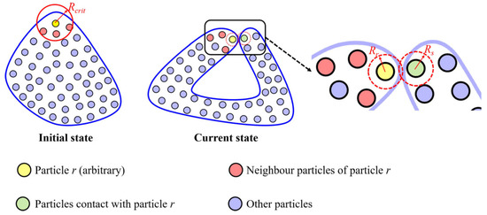 Despite the fact that the aforementioned grid-based contact algorithms have been improved and enhanced by many scholars due to their simplicity and efficiency, they inevitably have the following limitations. First, there is a tendency to encounter the “early contact” phenomenon, which is more prevalent in problems with large solution domains. Second, these methods typically rely on mass or volume gradients to estimate the contact normal, which can be inaccurate due to changes in particle position and distribution. Third, in quasi-static situations where velocity changes are negligible, accurately discerning contact is very challenging [21,22].