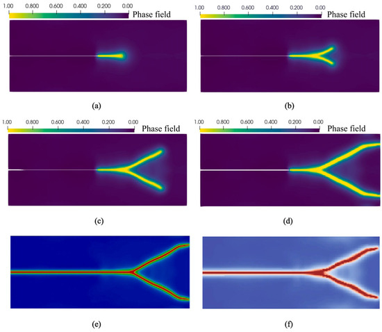 Evolution of dynamic crack propagation calculated by the PF-FEMPM method at times (a) , (b) , (c) , and (d) , (e) simulated by PF-FEM at and (f) simulated by PF-MPM at [78].