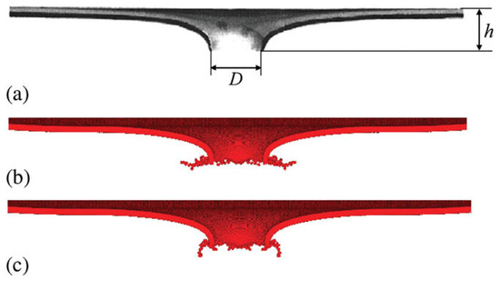 Final deformed shape of the target plate: (a) experimental graph; (b) obtained by the first contact method; (c) obtained by the second contact method [16].