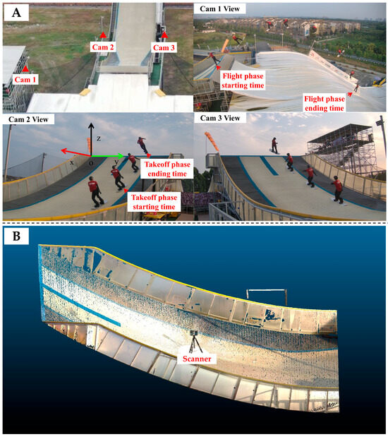 During the takeoff phase, 3D motion was captured, while 2D motion during the flight phase was recorded using three Z Cam E2 cameras (Shenzhen, China) positioned on both sides of the jump platform and at the referee stand (Figure 1A). Cameras were set to record at 50 Hz with a resolution of 1920 × 1080 and an exposure time of 1/800 s. Synchronization was achieved using sync cables. The jump platform was scanned using a terrestrial laser scanner (FARO Focus S150, Lake Mary, FL, USA), and point cloud data were processed with CloudCompare software (v2.12.4). Calibration was carried out with 28 existing platform markers (calibration volume: 9.4 × 7.9 × 4.2 m, Figure 1B). The known point on the top platform served as the origin of the coordinate system, with the x-axis pointing horizontally backward, the y-axis horizontally to the right, and the z-axis vertically upward (Figure 1A).