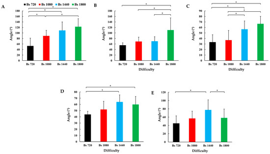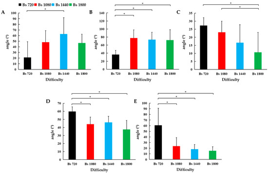 The joint angles at various difficulty levels at the end of the takeoff phase. (A) Upper trunk twist backside angle. (B) Shoulder horizontal abduction angle. (C) Hip extension angle. (D) Knee flexion angle. (E) Elbow flexion angle. Error bars represent the standard deviation (SD) and only show positive values. * indicates a significant difference compared to the previous difficulty level (p < 0.05).