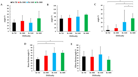 The joint angles at various difficulty levels at the initial moment of the takeoff phase. (A) Upper trunk twist frontside angle. (B) Shoulder horizontal abduction angle. (C) Hip flexion angle. (D) Knee flexion angle. (E) Elbow flexion angle. Error bars represent the standard deviation (SD) and only show positive values. * indicates a significant difference compared to the previous difficulty level (p < 0.05).