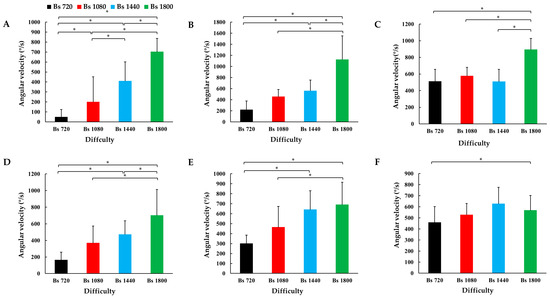 The maximal angular velocities at different difficulty levels during takeoff phases. (A) Upper trunk twist angular velocity. (B) Shoulder horizontal adduction angular velocity. (C) Shoulder horizontal adduction angular velocity. (D) Hip flexion angular velocity. (E) Knee flexion angular velocity. (F) Knee extension angular velocity. Error bars represent standard deviation (SD) and are displayed in the positive direction only. * indicates a significant difference compared to the previous difficulty level (p < 0.05).