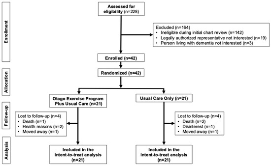 - Ries, J.D.; Carroll, M. Feasibility of a small group otago exercise program for older adults living with dementia. Geriatrics 2022, 7, 23. [Google Scholar] [CrossRef]