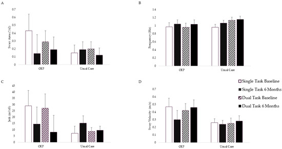 Single-task and dual-task posture in the Otago Exercise Program (OEP) plus usual care compared to usual care alone groups at baseline and 6 months for (A) sway area, (B) frequency, (C) jerk, and (D) sway velocity.