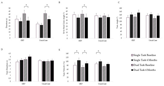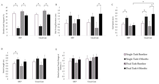 Single-task and dual-task timed-up-and-go (TUG) in the Otago Exercise Program (OEP) plus usual care compared to usual care alone groups at baseline and 6 months for (A) double limb support, (B) mid-swing elevation, (C) gait speed, (D) stride length, and (E) medial–lateral trunk range of motion; * p < 0.05.