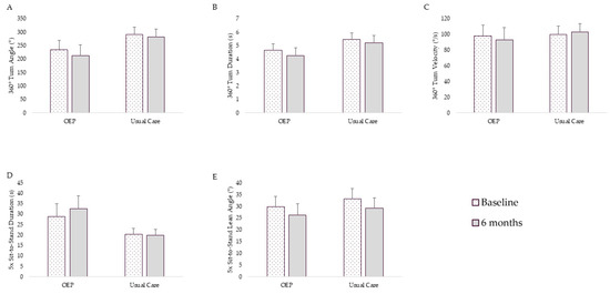 Functional mobility measures in the Otago Exercise Program (OEP) plus usual care compared to usual care alone groups at baseline and 6 months for (A) 360° turn angle, (B) 360° turn duration, (C) 360° turn velocity, (D) 5x sit-to-stand duration, and (E) 5x sit-to-stand angle.