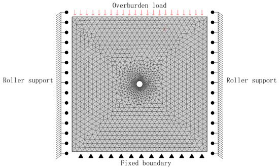 The three-dimensional geometric model was simplified to a two-dimensional planar model using COMSOL numerical simulation software. A square model with a side length of 10 m was established. The boundaries around the gas seepage field model were set as zero flux (used to simulate impermeable geologic barriers (e.g., dense rock formations, faults, or geologic formations) to stop gas flow), the left and right boundaries were set as roller supports (used to simulate a model that is constrained on both sides by the surrounding rock (e.g., horizontal geopathic stress effects) but can settle or expand in the vertical direction due to gas extraction), the upper boundary was applied with a constant load (vertical pressure applied to the top of the model to simulate self-weight or tectonic stresses in the overlying rock formation) of 6.3 Mpa, the lower boundary was set as a fixed support (acts on the bottom of the model to simulate the support of the upper strata by a stable rock layer unaffected by mining), and the boundaries of the extraction boreholes were set as the Dirichlet boundary conditions (used to simulate the active extraction of gas by negative extraction pressure in extraction boreholes).