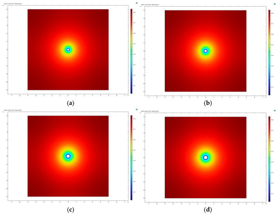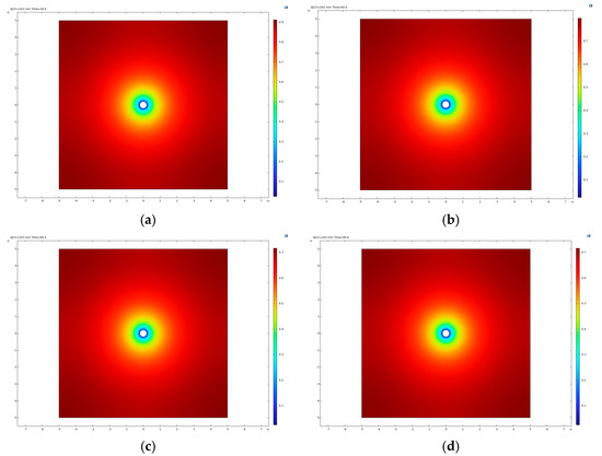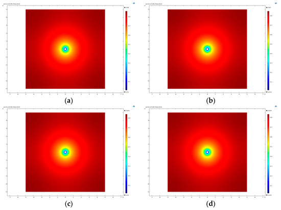 Gas pressure cloud at different borehole diameters: (a) 120 mm, (b) 153 mm, (c) 203 mm, (d) 253 mm.