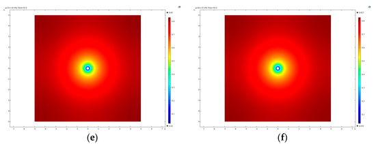 Figure 2 shows the cloud diagram of gas pressure change in the coal body around the drill hole when the negative pressure of extraction is 10 kPa, 15 kPa, 20 kPa, 25 kPa, 30 kPa, and 35 kPa, respectively. According to the analysis of Figure 2, when extracting the gas from the coal body, due to the existence of the pressure difference between the negative pressure of extraction and the gas pressure of the coal seam, the gas pressure of the coal body around the drill hole decreases more, and the gas pressure of the coal body far away from the drill hole decreases slightly but is basically equal to the initial gas pressure of the coal seam. The gas pressure is slightly decreased but basically equal to the initial gas pressure of the coal seam, and the gas pressure is basically negatively correlated with the negative pressure of extraction.