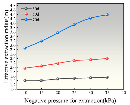 Figure 3 shows the variation in effective extraction radius at different extraction negative pressures (10 kPa, 15 kPa, 20 kPa, 20 kPa, 25 kPa, 30 kPa) and at different extraction times (30 d, 50 d, 70 d), and Table 2 shows the variation in effective extraction radius under different extraction times. According to Figure 3 and Table 2, it can be seen that the effective extraction radius changes in the range of 1.39 m–1.55 m, 1.96 m–2.40 m, and 2.87 m–4.38 m under the extraction times of 30 d, 50 d, and 70 d, corresponding to the negative pressures of 10 kPa, 15 kPa, 20 kPa, 25 kPa, 30 kPa, and 35 kPa respectively, and the effective extraction radius changes in the range of 1.39 m–1.55 m, 1.96 m–2.40 m, and 2.87 m–4.38 m, respectively, when the extraction time is the same; the higher the negative pressure of extraction, the larger the effective extraction radius is. When the extraction time is the same, the higher the negative pressure, the larger the effective extraction radius, but with the increasing negative pressure, the effective extraction radius increases, but when the negative pressure increases to a certain critical value, the effective extraction radius rate decreases significantly.