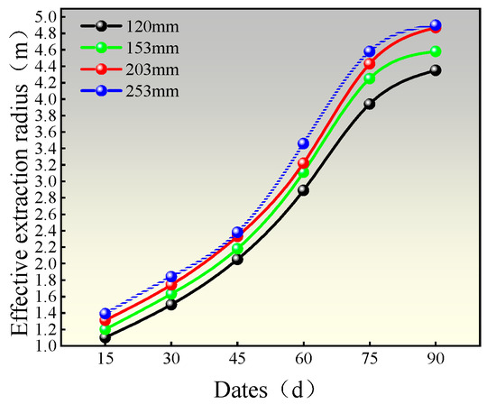 Figure 4 shows the cloud diagram of gas pressure change around the drill hole when the drill hole diameter is 120 mm, 153 mm, 203 mm, and 253 mm, respectively. Figure 5 shows the variation in effective extraction radius under different drill hole diameters. According to Figure 4 and Figure 5, the maximum effective extraction radius is 4.35 m, 4.58 m, 4.87 m, and 4.90 m when the diameter of the drill hole is 120 mm, 153 mm, 203 mm, and 253 mm, respectively, and the effective extraction radius is the smallest when the diameter of the drill hole is 120 mm and is the maximum when the diameter of the drill hole is 253 mm, which shows a positive correlation between the diameter of the drill hole and effective extraction radius. The effective extraction radius is the smallest when the borehole diameter is 120 mm and is the largest when the borehole diameter is 253 mm, and the positive correlation between the borehole diameter and the effective extraction radius is shown, but when the borehole diameter increases from 203 mm to 253 mm, the effective extraction radius only increases by 0.03 m, and the effective extraction radius has no obvious change.