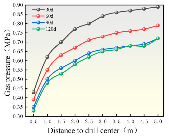 Figure 6 shows the variation in gas pressure around the borehole at different extraction times (30 d, 60 d, 90 d, 120 d) when the diameter of the borehole is 203 mm and the negative extraction pressure is 25 kPa. Figure 7 shows the variation in gas pressure at different distances (0.5 m, 1.0 m, 1.5 m, 2.0 m, 2.5 m, 3.0 m, 3.5 m, 4.0 m, 4.5 m, 5.0 m) from the center of the borehole with different extraction times (30 d, 60 d, 90 d, 120 d). According to Figure 6 and Figure 7, it can be concluded that the longer the extraction time, the larger the decrease in gas pressure, the faster the decrease rate, and the larger the effective extraction radius, which is basically a positive correlation, and the change in gas pressure is more obvious with the increase in extraction time. When the extraction time is 30 d, the change in gas pressure is small, and it only decreases in the range of 2.5 m in the borehole, and there is no significant change in the gas pressure in the rest of the range; when the extraction time is 60 d, the effect of gas extraction improves compared to 30 d, and it can satisfy the expected effect of extraction, but the scope of influence of extraction is limited; when the extraction time is 90 d, the effect of extraction improves significantly compared to 60 d, and the scope of influence of extraction increases, but the extraction time increases, the effective extraction radius increases, and with the increase in extraction time, the gas pressure changes more significantly. When the extraction time is 90 d, the extraction effect is obviously improved compared with 60 d, and the influence range of extraction is increased, but after the extraction time is more than 90 d, the gas pressure decreases, and the influence range is obviously reduced.