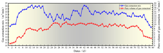 For working face 15101, the mineable length is approximately 270 m, with a daily advance rate of 3.4 m. The directional high-level long borehole coverage section was fully extracted within 80 days of mining activity. Consequently, an 80-day observation period was conducted on the gas extraction performance of the directional boreholes, during which key parameters including pure gas extraction volume, mixed gas volume, gas concentration at the upper corner, and gas concentration in the return airflow were systematically recorded.