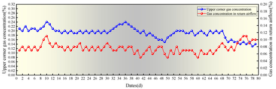 Gas concentration variation curves at the upper corner (return airflow) in the extraction section of directional high-level long boreholes.