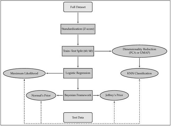 This section details the machine learning methods used for ECG rhythm classification. The overall goal was to identify each rhythm class by comparing traditional and interpretable models using pre-engineered features. Two main strategies were explored: (i) K-Nearest Neighbors (KNNs) applied after dimensionality reduction, and (ii) logistic regression (LR) models under frequentist and Bayesian paradigms. Figure 1 (previous section) provides a schematic overview of the complete modeling pipeline.