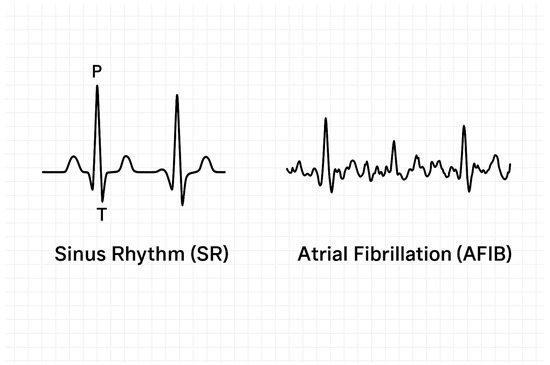Illustrative ECG waveforms. (Left): SR with regular morphology; (Right): AFIB with absent P waves and irregular R-R intervals.
