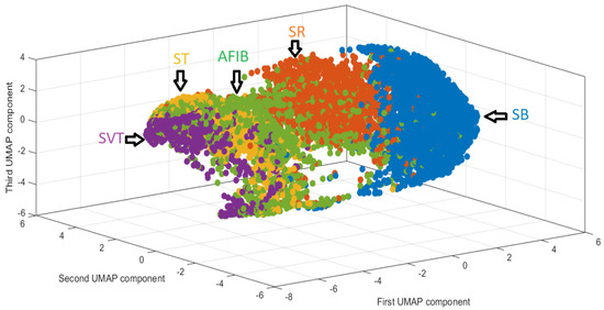 Low-dimensional UMAP representation of ECG records colored by rhythm class.