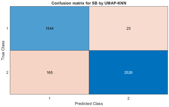 The results demonstrate that UMAP-KNN outperforms other models in PPV, NPV, sensitivity, and F1-score for SB, SR, and ST, confirming its robustness in handling irregular and imbalanced classes. Although LR-ML leads in PPV for AFIB and in sensitivity for SVT, UMAP-KNN provides more balanced performance across all rhythms. Logistic regression models, especially LR-BJ and LR-BN, achieve high NPV and specificity, particularly in SB, SVT, and AFIB. Notably, LR-BJ shows perfect specificity (100%) for SR and ST. However, the logistic models fail to identify SR and ST in terms of sensitivity, with F1-scores close to zero. Overall, LR-BJ performs best for SB, with the highest F1-score (95.27%) and accuracy (96.43%). UMAP-KNN surpasses all others for SR and ST in F1-score (63.26% and 73.65%, respectively). LR-BN achieves the top F1-score for SVT (71.37%), although UMAP-KNN remains close. These outcomes are derived from confusion matrices of each model. As an illustration, Figure 4 presents the confusion matrix for UMAP-KNN on SB classification.