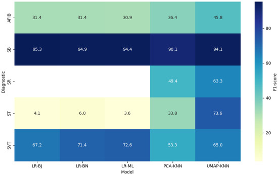 Compared to these deep learning approaches, our best-performing models—particularly UMAP-KNN—achieved more modest F1-scores, ranging from 63% to 95% depending on the rhythm class. As illustrated in Figure 5, UMAP-KNN outperformed all logistic regression variants in challenging and imbalanced classes such as SR, AFIB, and ST, despite its conceptual simplicity.