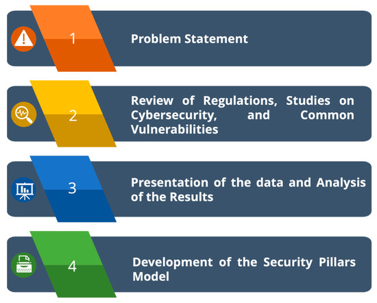 The literature review method employed in this research is comprehensive, with an integrated and structured approach aimed at developing a robust theoretical model for information security in medical devices. This approach allows for a thorough and detailed analysis of the most relevant aspects related to cybersecurity in medical environments, adapted to the current needs of the healthcare sector. The research is organized into four essential phases, each focused on addressing different components of the problem, from understanding the context to developing concrete solutions. These phases are designed to facilitate a systematic and coherent process, as illustrated in Figure 1.