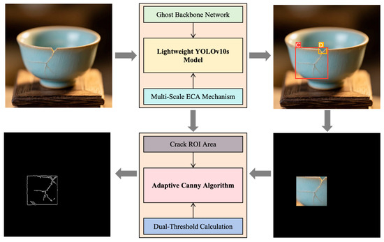As shown in Table 1, existing methods such as manual visual inspection, traditional machine vision-based inspection, object detection algorithms, and semantic segmentation algorithms have all played their respective roles in the field of ceramic product defect detection. However, they also come with some notable limitations. For instance, manual visual inspection is inefficient and has poor data traceability. Traditional machine vision has limited functionality and is susceptible to environmental interference. Although object detection algorithms boast strong real-time performance, they have high model complexity and resource requirements. Semantic segmentation algorithms can provide fine-grained boundary information but suffer from a large computational load and poor real-time performance. In addition, these methods often struggle to simultaneously meet various demands such as detection accuracy, efficiency, and adaptability. Furthermore, in actual production applications, ceramic products have a wide variety and complex types of defects, placing even stricter requirements on inspection technologies. To address these challenges, this study proposes a deep-learning-based ceramic product defect detection algorithm. The main workflow is illustrated in Figure 1. First, the algorithm utilizes a lightweight YOLOv10s detector to process the input images. It is used to identify and locate four common types of defects: cracks, glaze deficiency, breakage, and black spots. At the same time, it designates the defect areas containing cracks as regions of interest (ROIs). Subsequently, within the ROIs, an adaptive Canny detection technique is employed to accurately capture and locate the edges of cracks, thereby providing strong support for subsequent process improvements.