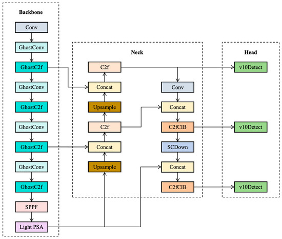 To further enhance the operational efficiency of the model, this study proposes a lightweight-optimized YOLOv10s model, with its detailed architecture illustrated in Figure 3. During the optimization process, we first redesigned the backbone network using GhostNet. This network significantly reduces the model’s parameter count and computational load through an efficient feature reuse strategy. On this foundation, we also devised an ECA (Efficient Channel Attention) mechanism fused with depthwise separable convolutions and applied it to improve the original PSA (Position-Sensitive Attention) module. This enhancement aims to boost the model’s inference speed and strengthen its ability to capture key features. Ultimately, the optimized YOLOv10s model achieves a substantial leap in operational efficiency while maintaining high precision.