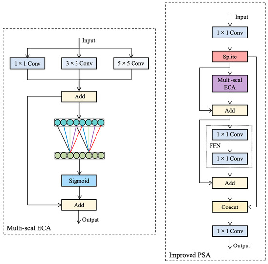 The network architecture of the improved PSA module is illustrated in Figure 5. Its core innovation lies in the integration of a multi-scale enhanced ECA module. Specifically, in the design of the multi-scale enhanced ECA module, the input feature map is first fed in parallel into three depthwise separable convolutional layers with kernel sizes of 1 × 1, 3 × 3, and 5 × 5, respectively. These layers are capable of capturing spatial information at different scales. Subsequently, the weighted-fused channel features are passed into a one-dimensional convolutional layer, which aggregates information from adjacent channels through local cross-channel interactions, thereby adaptively capturing inter-channel dependencies. The output of the one-dimensional convolutional layer is then normalized using a Sigmoid activation function to obtain attention weights. Finally, these weights are used to reweight each channel of the input feature map, enhancing the feature representation of important channels while suppressing the influence of unimportant ones, thereby improving the network’s ability to capture key features.