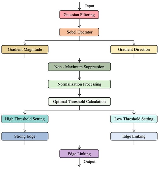 As illustrated in Figure 6, the complete process of the Adaptive Canny Edge Detection Algorithm is shown. First, the input image undergoes Gaussian filtering to effectively reduce noise interference by smoothing the image. Next, the Sobel operator is used to calculate the gradients of the image in the x and y directions, yielding the gradient magnitude (indicating edge strength) and gradient direction (for subsequent edge refinement). Then, non-maximum suppression is applied to the gradient magnitude to retain local maxima along the gradient direction, thereby refining the edges and making the detected edges more precise while reducing the occurrence of false edges. After that, the gradient magnitude after non-maximum suppression is normalized to a range suitable for processing by the adaptive threshold algorithm. The adaptive threshold algorithm analyzes the image’s grayscale histogram and automatically calculates the threshold that maximizes the inter-class variance. The high threshold is directly set to the optimal threshold, and the low threshold is set to half of the high threshold. Subsequently, double-threshold processing is employed to retain strong edges that are above the high threshold and weak edges that fall between the high and low thresholds. Finally, an edge linking algorithm is used to connect the weak edges with the strong edges, forming a continuous and complete edge map. This improvement enables the Canny algorithm to adaptively determine thresholds without manual intervention, significantly enhancing the accuracy and robustness of edge detection. Meanwhile, due to the automatic determination of thresholds, the algorithm’s processing efficiency is also significantly improved, making edge detection faster and more efficient.