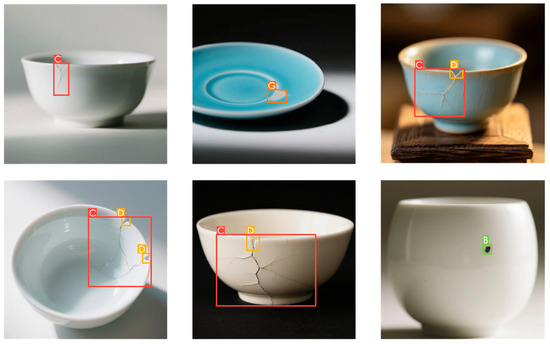 During the data collection phase, the research team first gathered defective ceramic products from the market and used high-resolution cameras (Canon EOS R5, Canon Inc., Tokyo, Japan) to capture detailed images under various lighting conditions to obtain authentic and diverse samples. Meanwhile, to supplement the natural samples, the team simulated the creation of defective samples in a laboratory environment. For instance, damage was simulated by gentle tapping, and black spots were replicated using specific chemicals, ensuring the completeness and representativeness of the dataset. Considering that the study focused on the products themselves, the team selectively collected ceramic crafts with relatively uniform colors and shapes during the collection process, discarding handicrafts with complex colors or intricate designs to ensure data consistency and relevance.