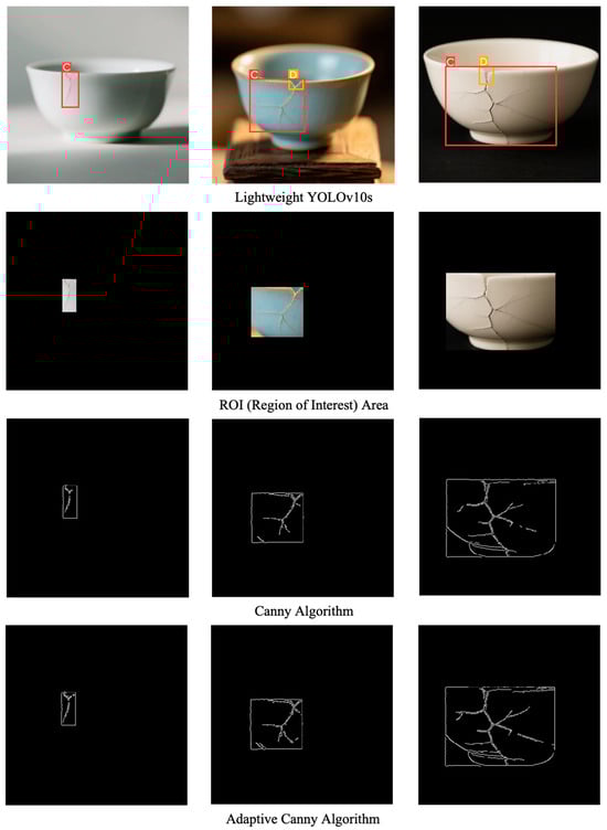 To validate the improvement effects of the adaptive Canny algorithm in ceramic product crack detection, this study utilized the lightweight YOLOv10s model to filter out defect images containing cracks as the experimental dataset. ROIs were precisely delineated based on the detection boxes to focus on crack features and reduce background interference. The impacts of the key improvement strategies of the algorithm were systematically analyzed through ablation experiments, and the results are presented in Table 5.