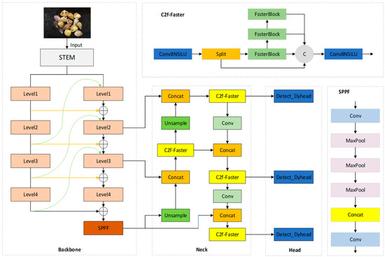 To address the challenges of high model complexity and insufficient recognition accuracy in current clam detection technologies, this study proposes a lightweight optimization detection solution based on YOLOv8. The improved model introduces enhancements to the backbone, neck, and detection head of YOLOv8. The architecture of the improved model is shown in Figure 3.