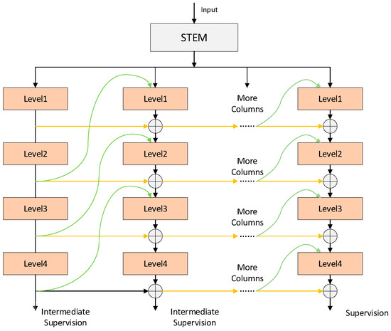 RevColNet (Reversible Connected Multi-Column Network) is a lightweight backbone architecture designed to enhance feature representation while reducing information loss. It achieves lossless cross-layer feature transmission through a multi-column design and reversible connection mechanism, improving the fusion of contextual information. This makes it particularly suitable for small object detection tasks, where preserving low-level details is crucial [16]. The macro structure of RevColNet is shown in Figure 4.