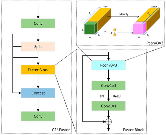 Secondly, although the C2f module used in YOLOv8 enhances the image feature extraction capability, the stacking of Bottleneck modules inevitably leads to redundant information channels and increased inference workload. To address these issues, the Faster Block module is integrated into C2f, thereby reducing the model’s computational cost and floating-point operations (FLOPs). This structure adopts the Partial Convolution (PConv) mechanism, where convolution is applied only to a subset of channels while the remaining channels remain unchanged, effectively reducing redundant computations and memory access overhead. This approach significantly lowers computational complexity and FLOPs while maintaining—or even enhancing—the model’s feature representation capability and detection performance, demonstrating superior inference efficiency and deployment advantages.
