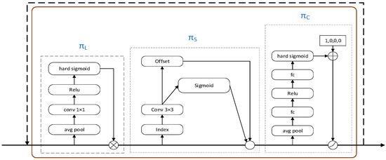 In the formula, represents task-aware attention, represents spatial-aware attention, represents scale-aware attention, and F represents the feature vector.