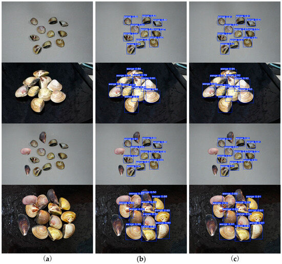 To assess the detection performance of the improved model, representative data from dispersed placement, clustered placement, and multi-object scenarios were selected for visualization experiments. The comparison results between the improved YOLOv8 algorithm and the original YOLOv8 are shown in Figure 9. The results indicate that the improved YOLOv8 algorithm demonstrates significant advantages in both recognition accuracy and bounding box regression performance. Particularly in multi-object stacking scenarios, the original YOLOv8 algorithm tends to make erroneous detections and exhibits lower recognition accuracy, while the improved model effectively mitigates issues related to low accuracy and misidentification of clams. Additionally, the improved algorithm can accurately distinguish similar targets in multi-object scenarios, significantly improving the precision of clam target localization and feature recognition. These experimental results further demonstrate the practicality of the improved algorithm in complex scenarios.