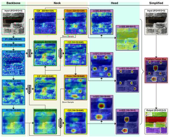 To better adapt to the needs of building damage detection, we strictly followed the native configuration specifications of YOLOv8, set the image input size to 512 × 512, and used the “x” version model to obtain stronger feature extraction capabilities. At the same time, we used its default three-layer detection head structure (Head0, Head1, and Head2), corresponding to the three-layer feature maps of P3, P4, and P5, covering small, medium, and large spatial scales. In the detection process, the model can find and identify each gray brick in the image and assess its damage, which helps in counting the gray bricks and analyzing the damage on their surfaces. In addition to enhancing the model’s visualization, expression, and engineering practicality, this paper integrates the feature fusion heatmap in the simplified path, which clearly shows the response area focused on by the model in feature maps of different scales. The final output result (Output) has a size of 512 × 512 × 3, where different color channels represent different prediction categories (such as missing, cracked, contaminated, etc.) to intuitively show the positioning and classification effect of YOLOv8 in gray brick damage detection.