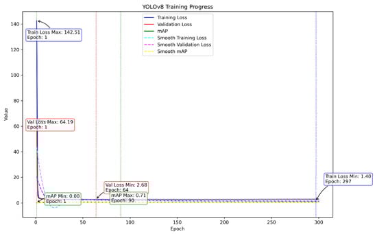 As shown in Figure 3, the YOLOv8 model showed good convergence and stability during the training process of the dataset for damage to Macau’s gray brick walls in this study. The model’s train loss reached 142.51, validation loss was 64.19, and mAP was 0.00 at the first epoch, reflecting that the model was still in the early stages of feature learning at the initial stage. As the training continued, the loss value dropped rapidly, and the validation loss dropped to a minimum of 2.68 at the 64th epoch, indicating that the model’s fit to the validation set was optimal. At the same time, the mean average precision (mAP) reached a peak of 0.71 at the 90th epoch, indicating that the model’s comprehensive performance in multi-class damage identification had reached a stable level. Finally, at the end of the 297th epoch of training, the training loss dropped to a minimum of 1.40, indicating that the model’s error on the training set was tiny and the training process tended to converge.