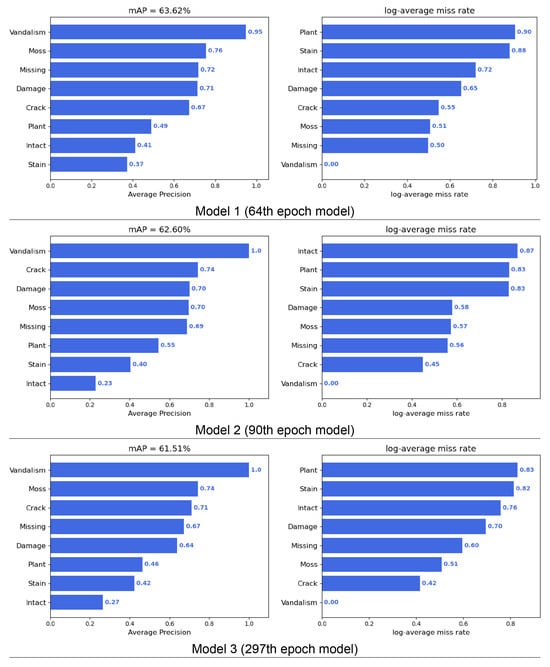 After completing the training of the YOLOv8 model, this study selected the 64th epoch (Model 1), the 90th epoch (Model 2), and the 297th epoch (Model 3) in the training process as representative models and compared and evaluated their detection performance on the test set to further verify the optimal performance timing and stage stability of the model in the task of identifying damage to gray brick walls (Figure 4). The mean average precision (mAP) of each model was 63.62%, 62.60%, and 61.51%, respectively, and the corresponding log-average miss rate (LAMR) also showed obvious differences in the category dimension.