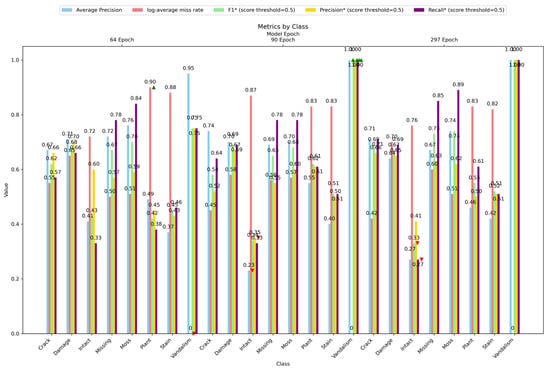 At the 297th epoch model stage, although the overall mAP further dropped to 61.51%, some categories showed more mature detection capabilities, especially in the moss and missing categories, with recall reaching 0.89 and 0.85, respectively, and F1 reaching 0.74 and 0.73. This result shows that the model’s detection coverage of common damaged targets has been significantly improved at the end of training, and the missed detection rate has been controlled (LAMR = 0.51 and 0.60). At the same time, the recall of the crack category rose to 0.71, and the precision also reached 0.66, indicating that the model, at this stage, has achieved a coordinated improvement in detection accuracy and recall rate for crack-type targets. However, like the previous stage, the performance of the three categories of intact, plant, and stain is still lagging behind, especially the recall of intact is only 0.27, indicating that the model still finds it difficult to extract effective features from non-damaged textures, and the problems of misjudgment and missed judgment have not been eradicated.