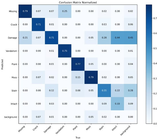 Looking more closely at how well the three-stage model identifies different types of gray brick damage, using the confusion matrix helps us to better understand how well the YOLOv8 model can tell the difference between various labels and where it tends to make mistakes in real situations (Figure 6, Figure 7 and Figure 8). Model 1 had a high accuracy rate of 0.79 for identifying missing bricks, showing it can reliably spot missing damage; it scored 0.57 for cracks, 0.68 for damage, and 0.89 for moss. Model 1 achieved a high recognition accuracy rate (0.79) in the missing category, showing a stable ability to distinguish brick-missing damage, while crack, damage, and moss reached 0.57, 0.68, and 0.89, respectively. In particular, the recognition of the moss category was the most stable, with almost no confusion. In the plant, stain, and intact categories, the accuracy rate was much lower, especially for stain and intact, which were only 0.52 and 0.44, respectively, and many were wrongly identified as damage, background, or each other. This shows that the model struggles to see the small differences between surface stains, natural attachments, and the brick surface itself. It is important to note that the vandalism category does well in all models (with an accuracy close to 1.00) because it has clear texture edges, noticeable local changes, fewer differences in training samples, and is easier for the model to learn. It should be pointed out that although the vandalism category performs well in all models (with an accuracy close to 1.00), this improvement is mainly due to its clear texture edges, obvious local structural mutations, small differences in training samples, and ease of being efficiently learned by the model.