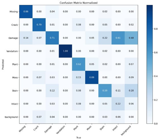 The confusion matrix of Model 2 shows that the model’s crack recognition ability is further enhanced (the accuracy rate rises to 0.71), and the performance of damage and missing classes is also relatively stable (both 0.71 and 0.79), indicating that the model maintains excellent stability for structural damage. At the same time, the recognition effect of the plant class has been significantly improved, reaching 0.77, indicating that the model has learned more boundary features of vegetation interference in the middle and late stages. However, the accuracy of the vandalism category dropped from 1.00 to 0.75, and some were misjudged as missing, which may be due to the strong similarity between local damage and the overall absence of bricks in the edge features of the image. In addition, there is still serious confusion between stain and intact. For example, 0.28% of the “stain” class is misjudged as background, indicating that the model is still not robust to fine-grained color differences and weak texture targets.