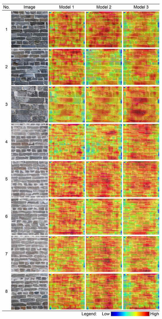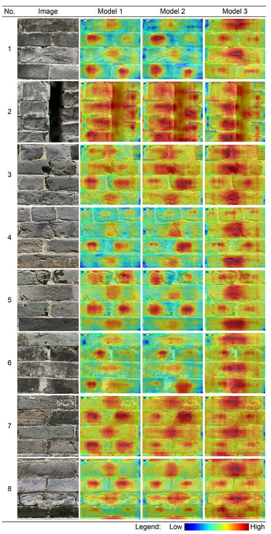 According to the results of the thermal map, the performances of Model 1, Model 2, and Model 3 in the actual image test can be confirmed. Model 3 shows a stronger, denser, and more focused response on the real gray brick damage area in most cases, and its overall performance is better than Model 1 and Model 2, especially in images with complex visual features and uneven damage distribution (Figure 9). From typical samples such as image numbers 1, 4, 5, 6, and 8, Model 3 shows a larger area and higher response intensity (the red area is denser) in the thermal map, accurately covering various types of gray brick damage such as cracks, breakage, peeling, weathering, and plant erosion. For example, in image 1 of Figure 9, Model 3 clearly captures the continuity of the brick joints and the fractured areas of the brick surface, while the responses of Model 1 and Model 2 are weak and discontinuous. In image no. 6 of Figure 9, multiple depressions and holes on the brick surface also obtain concentrated and consistent high responses in the thermal map of Model 3. However, it should be pointed out that the high-response areas marked by the three groups of models do not always accurately correspond to the specific locations of actual damage. This is mainly because the facade of a single brick was used as the frame selection unit during the marking stage in this study rather than accurate marking based on damage details. This strategy has affected the complete correspondence between the thermal map and the damaged location to a certain extent.