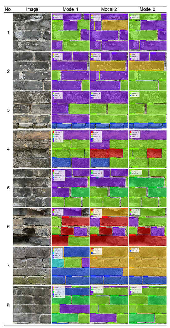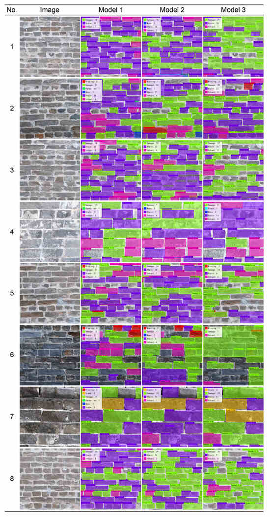 In the damage quantification test of the training set samples, by comparing images no. 1 to no. 8 in Figure 11 one by one, we can observe the performance differences of each model in terms of the damage-type distinction and brick-level selection accuracy in more detail. In image no. 1, only Model 2 successfully identified the crack label of a brick in the upper right corner, while Models 1 and 3 failed to identify the crack, indicating that Model 2 is more sensitive in extracting local detail features. In image no. 2, Model 3 showed the best overall recognition effect, not only accurately identifying cracks and stains but also accurately framing the damaged area in the lower part of the brick surface. Since the study’s guidelines say that damage is more serious than stains, Model 3’s ability to focus on identifying damage labels makes its performance more accurate and logical. Image no. 3 further verifies the robustness of Model 3. The obvious surface peeling and weathering marks in the upper half are accurately marked as “damage” rather than mistakenly marked as “stain”. In contrast, Models 1 and 2 are confused about their judgment regarding this area. In image no. 4, both Model 1 and Model 2 misclassified the damaged area as moss, obviously failing to correctly extract the texture features of material erosion. Although Model 3 made more accurate judgments overall, it still misclassified a missing area as damage. This is because the bricks in this area are not entirely absent; instead, the surface has peeled off more, which causes confusion regarding the label boundary. In image no. 5, Model 3 accurately identified most areas but misclassified one “damage” area as vandalism. This may be because the surface morphology of the brick is relatively abnormal, and the texture mutation is misjudged by the model as a sign of human intervention. In image no. 6, Model 3 shows a clear advantage and accurately judges the damaged properties of the second row of bricks, while Models 1 and 2 misclassify the area as missing, obviously confusing the bricks with an intact structure but a peeling surface with the empty bricks that are completely peeled off. In addition, Model 3 also performs well in other label recognition in this image, and the overall output result is stable and clear. In image no. 7, Model 3 accurately frames all cracked bricks, while Model 1 and Model 2 have some missed detections and false detections, which shows that Model 3 has a stronger perception and selection consistency on crack samples. Image no. 8 is a more challenging sample. All three models incorrectly label some types of damage caused by nature, like breakage or moss, as vandalism. This shows that the way we label these damages is often confusing and needs to be improved as we gather more data and adjust the model settings.
