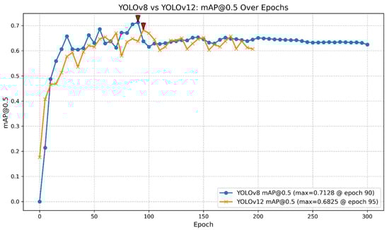 Comparison of mAP values during YOLOv8 and YOLOv12 model training. (Image source: drawn by the authors).
