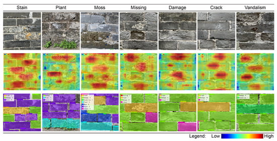 After completing the systematic evaluation and comparative analysis of the model performance, the research team finally selected Model 3 as the deployment model. This model showed better performance in multiple test dimensions, especially in terms of the intensity of heatmap responses, spatial focusing ability, and stability of damage identification, which were better than Model 1 and Model 2. Figure 14 shows the recognition effect of Model 3 on typical damage types, including seven categories: stain, plant, moss, missing, damage, crack, and vandalism. Through the triple comparison of images, heatmaps, and box selection results, the model’s recognition ability for different types of damage can be more intuitively observed.