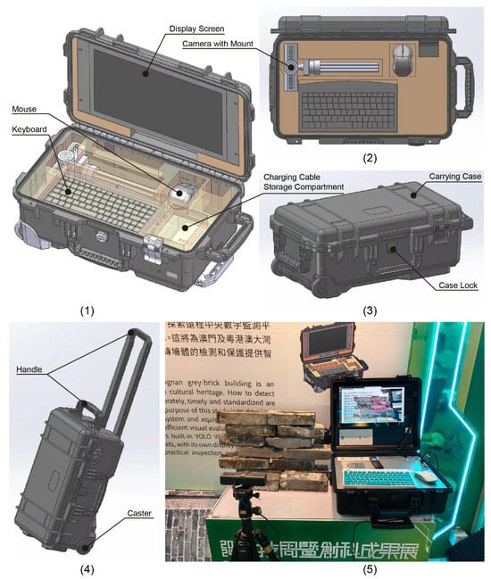 Finally, the research team deployed the trained YOLOv8 model to a portable smart terminal device (see sub-image 6 in Figure 1). The device integrates a portable high-definition camera, an embedded computing module, and a visual software interface, which can perform real-time detection and analysis of wall images directly on the construction site. The system supports image capture, damage identification, and result export functions, has the convenience of field operation, and is suitable for various practical application scenarios such as cultural relics inspection and maintenance assessment.