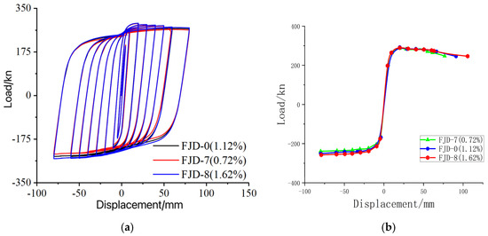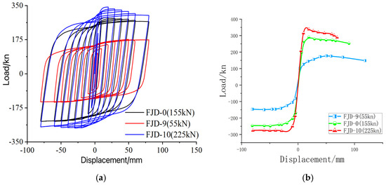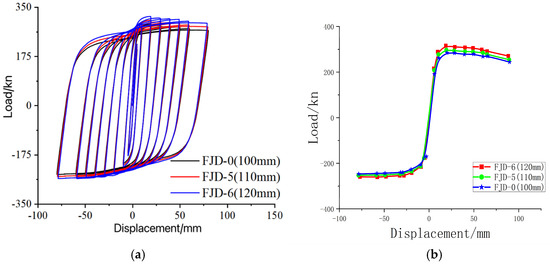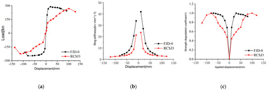 - The positive and negative direction yield loads of node FJD-0 increased by 78.9% and 70.0%, respectively, while the ultimate bearing capacity improved by 13.2% and 9.98%. The energy dissipation capability increased by 23%, and the stiffness of all loading loops was enhanced, leading to a significant improvement in overall stiffness and a slower rate of strength degradation, as well as enhanced strength retention. The participation of the floor slab slightly reduced ductility, but to a minor extent, still meeting seismic design requirements. In seismic design, attention should be paid to the interaction effects of the floor slab to optimize the node structure and enhance the overall seismic performance [31].
